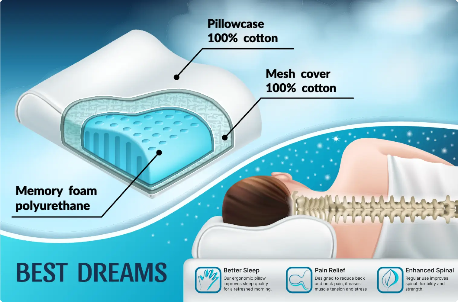 Discover the ease and advantages of our ergonomic pillow, providing personalized support and transforming your sleep experience for a revitalized and aligned body.