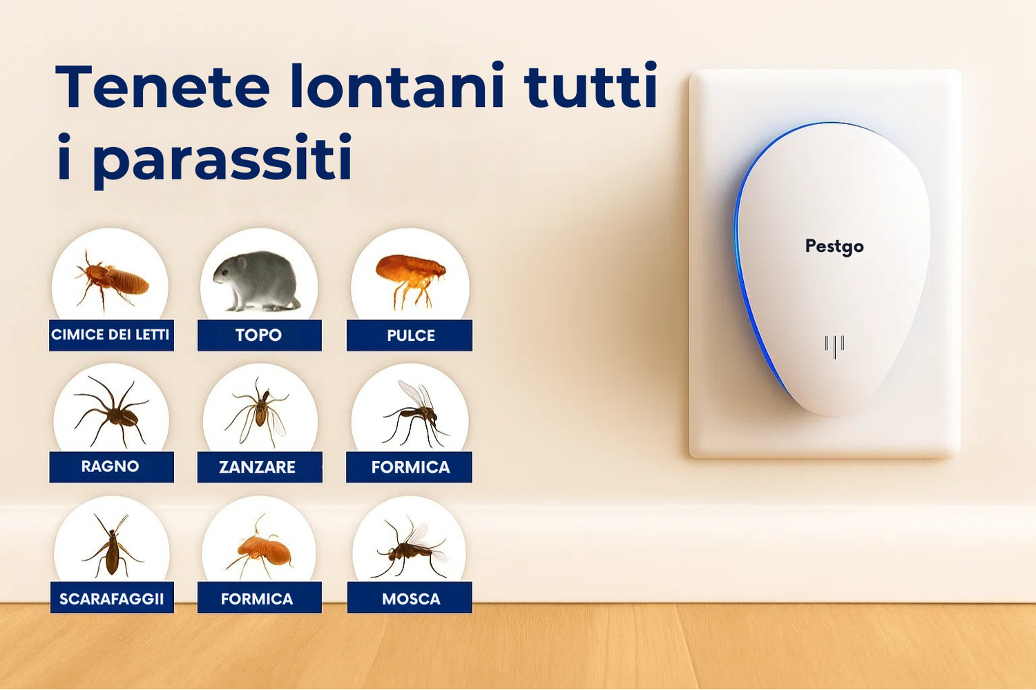 Pestgo offre una soluzione efficace e semplice per proteggere tutta la tua casa. Grazie alla sua avanzata tecnologia a ultrasuoni, respinge in modo sicuro parassiti come pulci, scarafaggi, formiche, ragni e roditori, senza l'uso di sostanze chimiche, trappole o causare alcun disordine. Basta collegarlo a una presa a muro per una protezione 24 ore su 24, 7 giorni su 7.