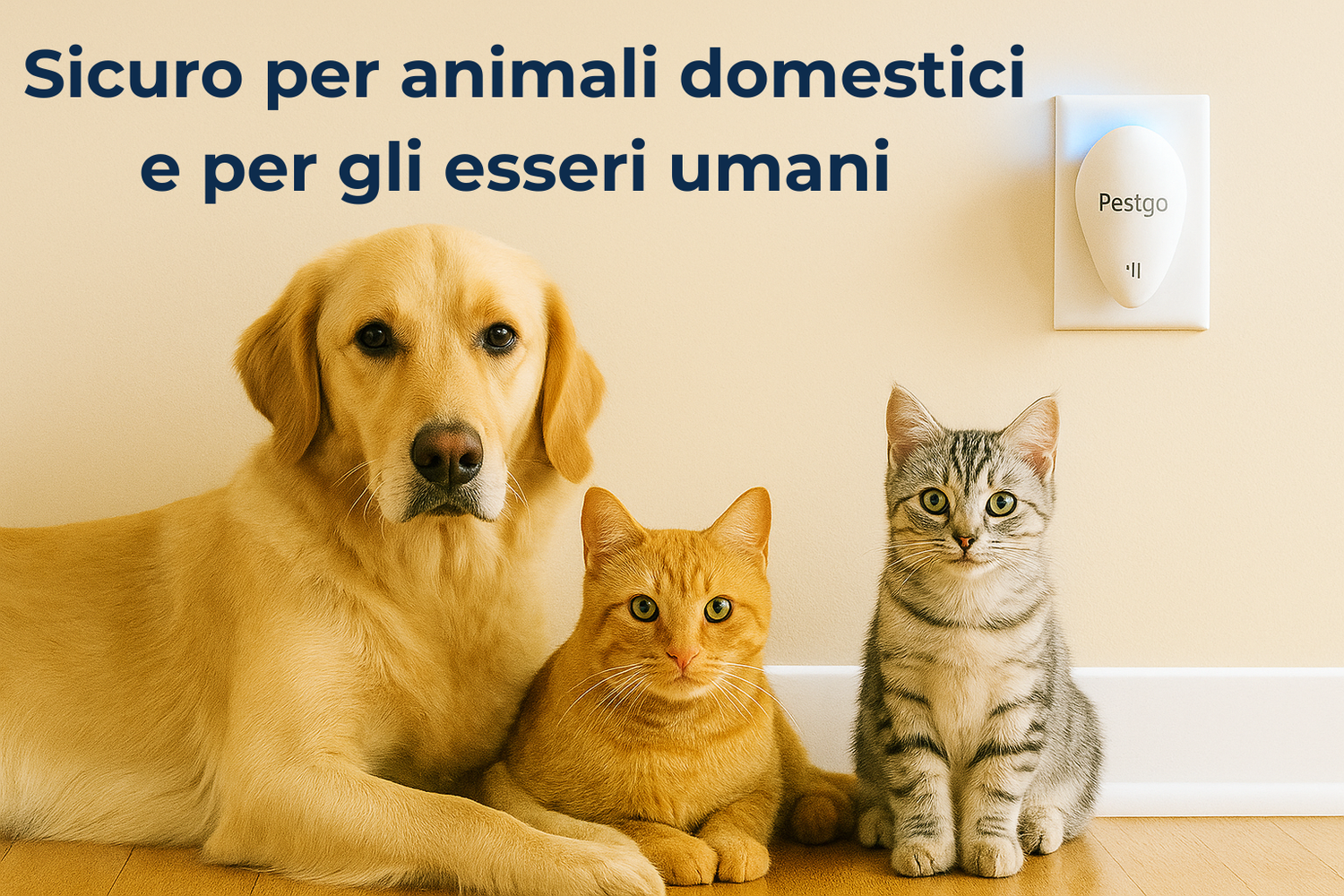 Pestgo è completamente sicuro sia per gli esseri umani che per gli animali domestici. A differenza degli spray o dei veleni, utilizza ultrasuoni a bassa frequenza, completamente impercettibili all'orecchio umano, senza alcun rischio per gli animali domestici o altri animali.